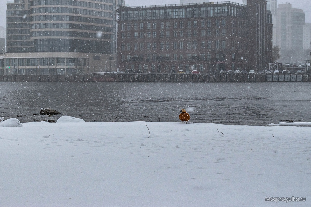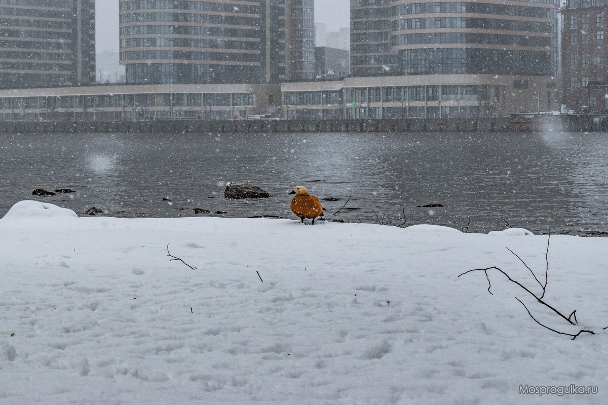 Утка (если я правильно понимаю, это огарь) чилит под снежком на фоне урбанистических пейзажей. За могучей спиной гордой оранжевой птицы - жилой комплекс "Акватория" и бизнес-центр "Ривер Сити".