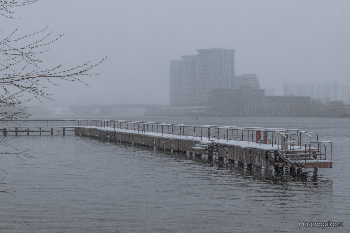 Особенно меня занимает вид в сторону жилого комплекса "Акватория". Грустного вида пирс, растворяющиеся во мгле здания, холодная чёрная вода и едва заметный Ленинградский мост так хорошо между собой сочетаются, что в ненастные дни их случайный союз превращается в один из самых серых и депрессивных видов Москвы.