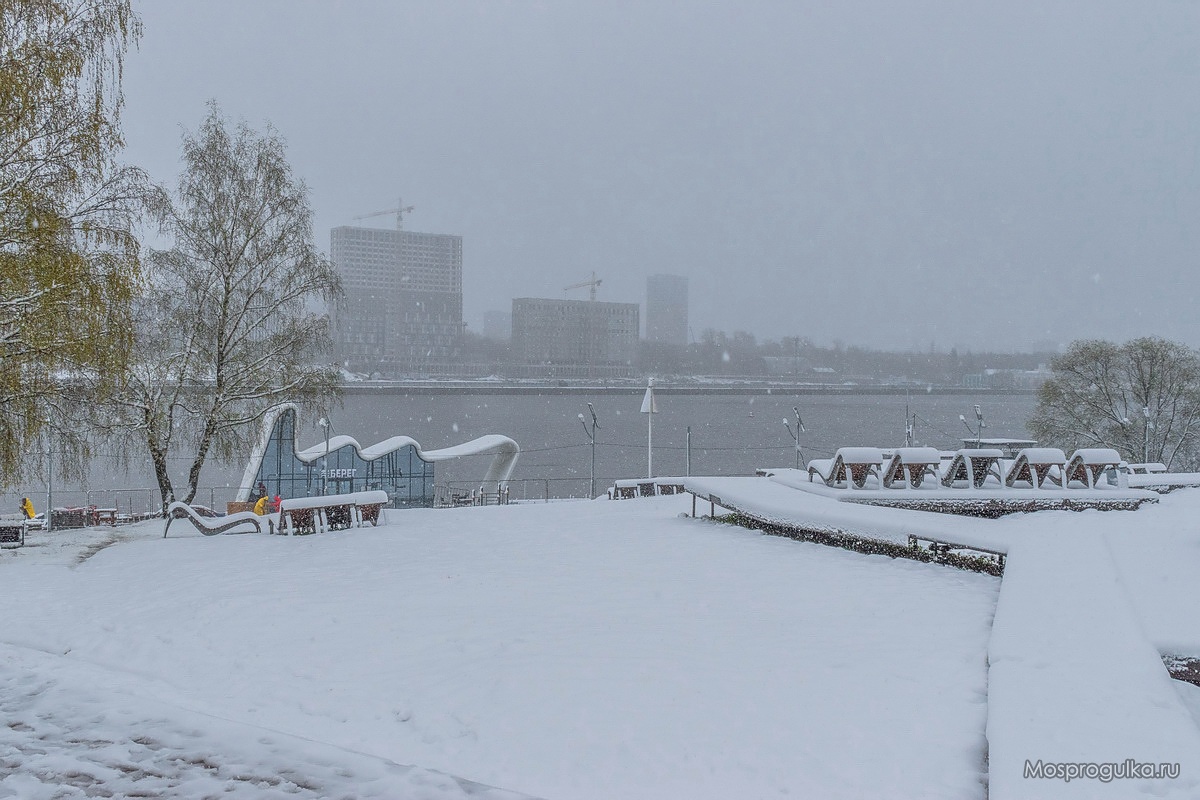 На склоне в центральной части парка бьёт ключом пляжная жизнь: деревянные лежаки, пользуясь отсутствием напуганных похолоданием и снегопадом москвичей, с радостным молчанием покрываются снегом.